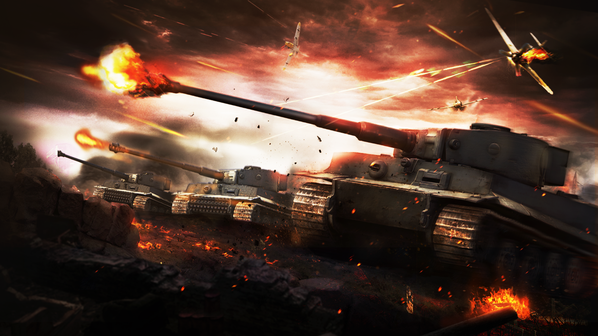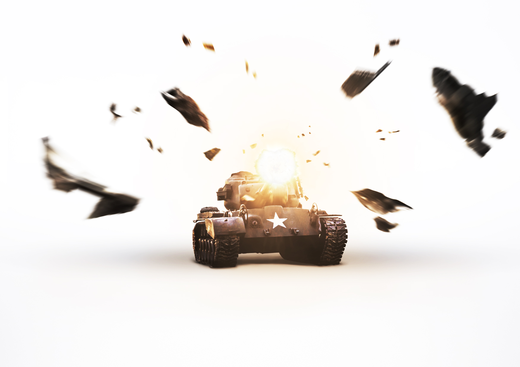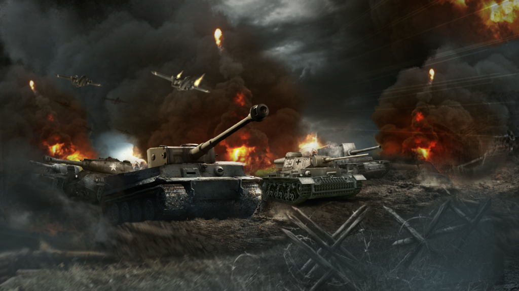 전통적인 전장룩 베이스로 낡고 그런지한 배경 속에서 입체 탱크와 카피를 강조시키는 것이 주요 포인트.